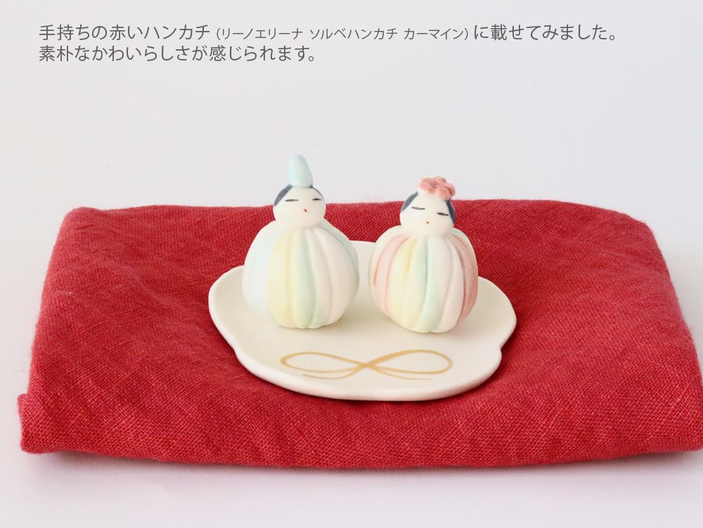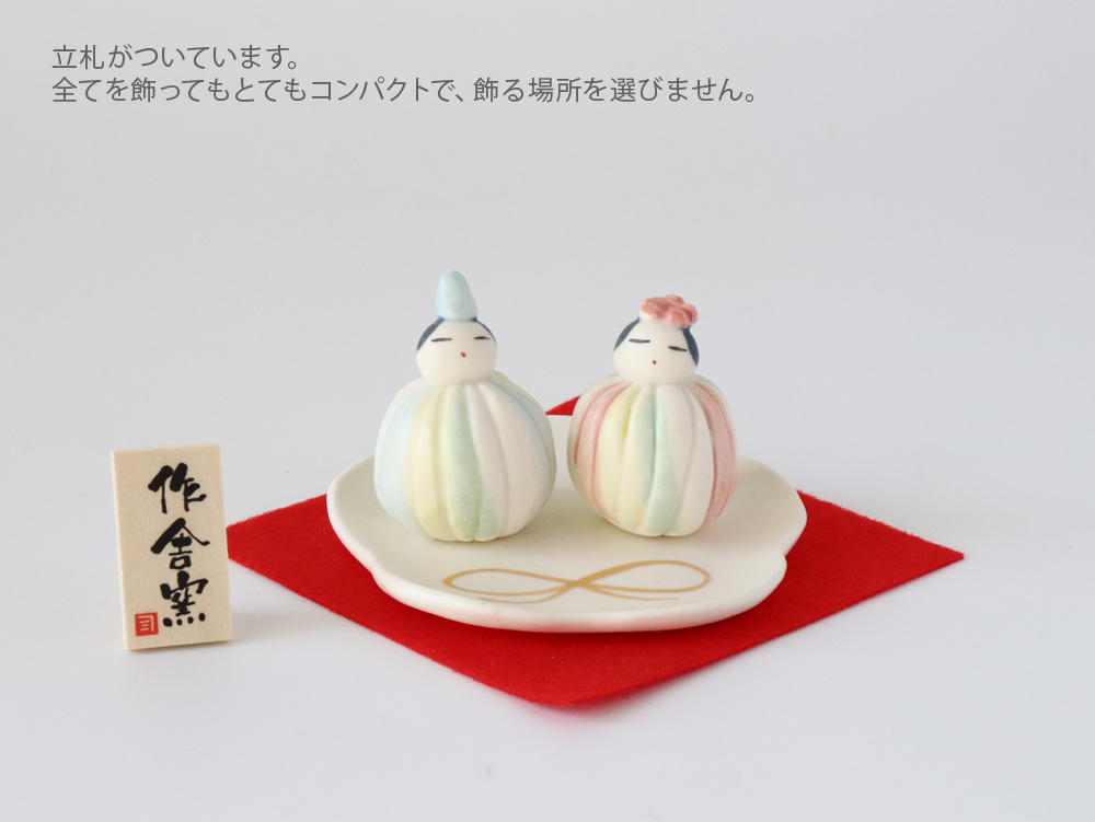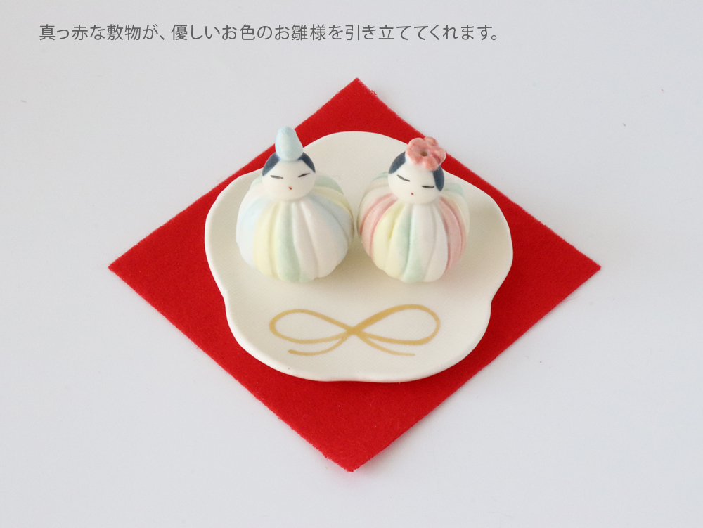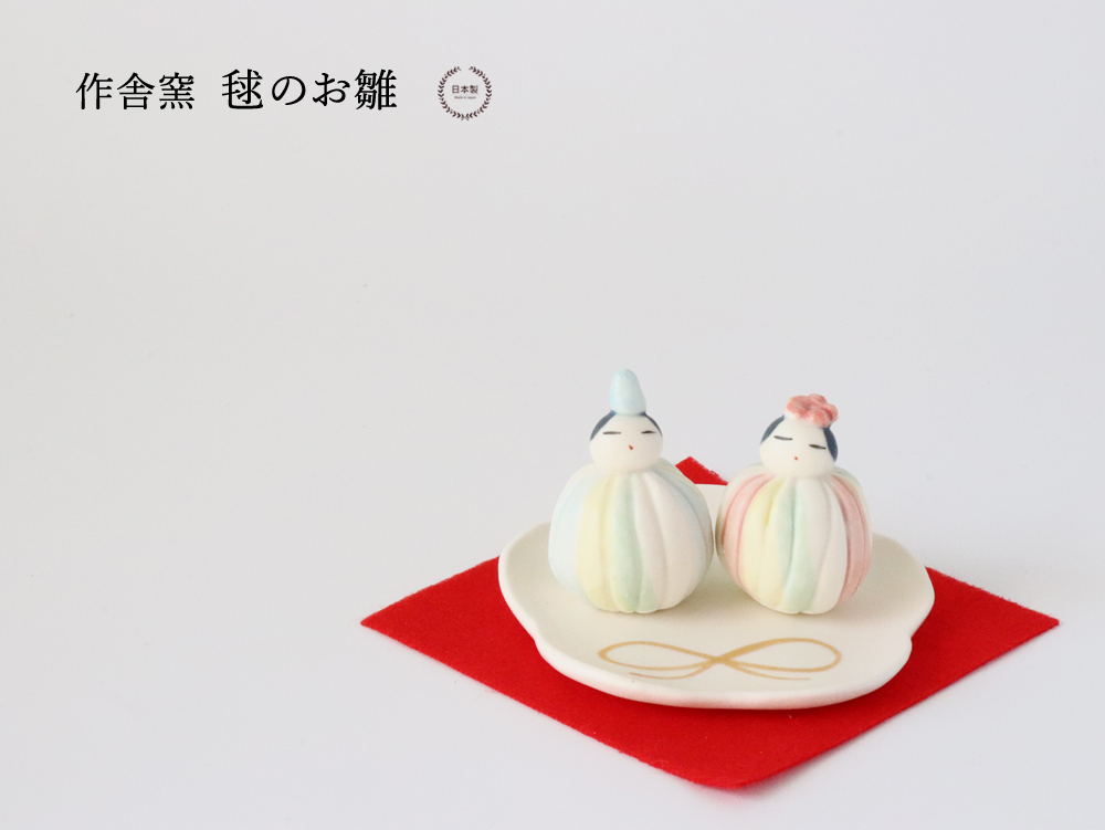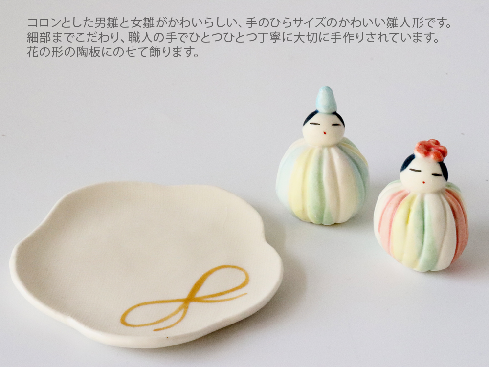 繊細な瀬戸焼で作られた、手毬のようにかわいらしい雛人形です。花の形をした陶板の上に、ちょこんと並ぶ小さな女雛と男雛。淡い色合いと優しい表情が特徴で、飾るだけで心温まる雰囲気を演出します。