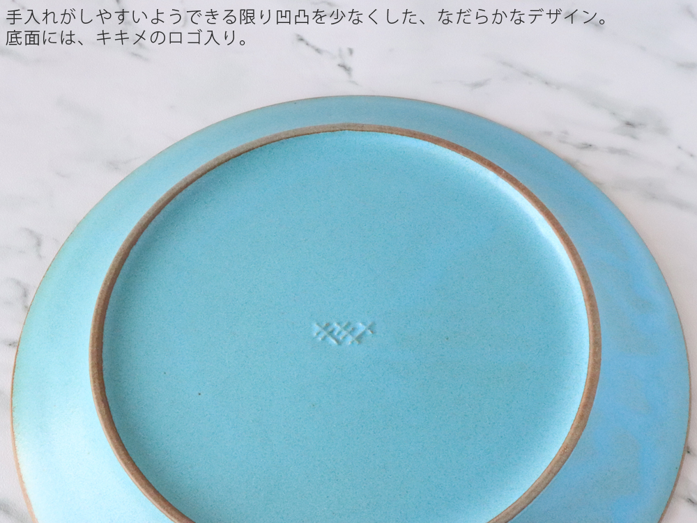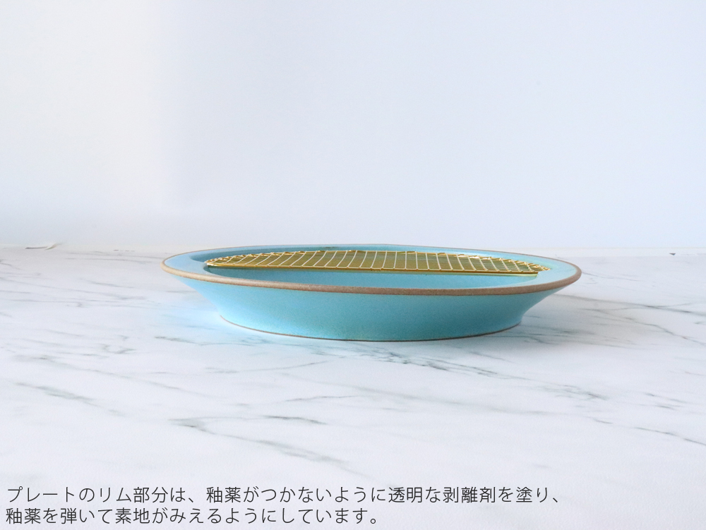 赤土の温かみがのぞくプレートのリム部分は、釉薬がつかないように透明な剥離剤を塗り、釉薬を弾いて素地がみえるようにデザイン。
