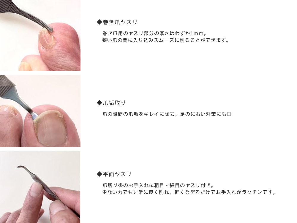 巻き爪用、通常の爪ヤスリ、爪垢取りが1本にまとまった