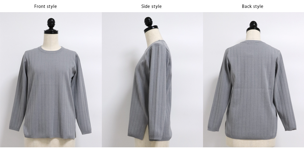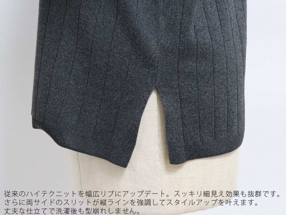 ワイド幅のリブ編みで体のラインを拾わず、縦のラインを強調するすっきりとしたデザインで細見え効果も抜群。