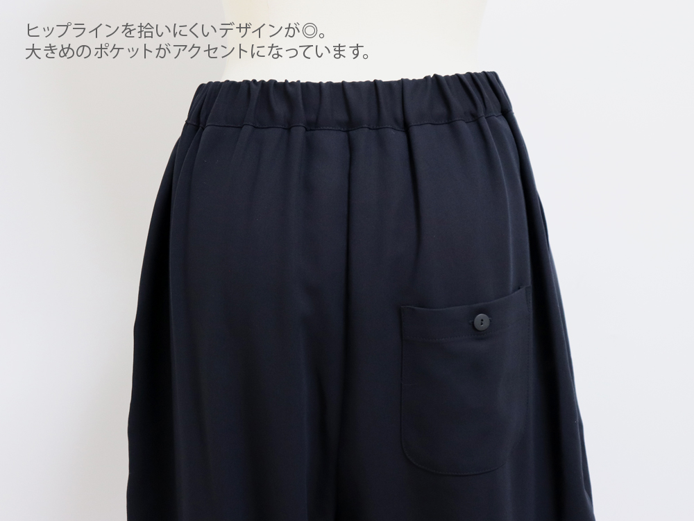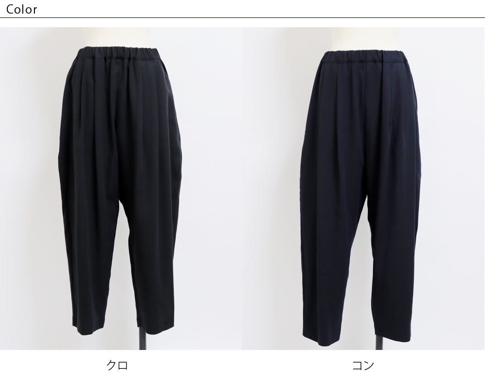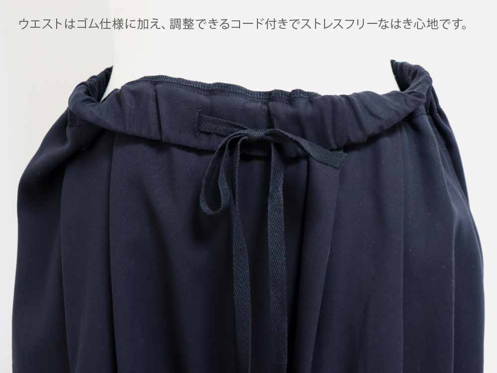 おなか周りが総ゴム、腰回りはゆったりとしたデザインで履いていてラクなのにスッキリ見える、というのが特徴のパンツ。素材違いで揃えられる方の多い、人気デザインです。