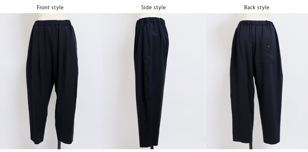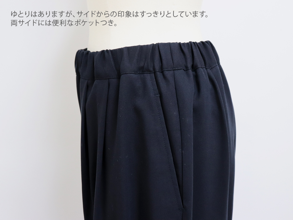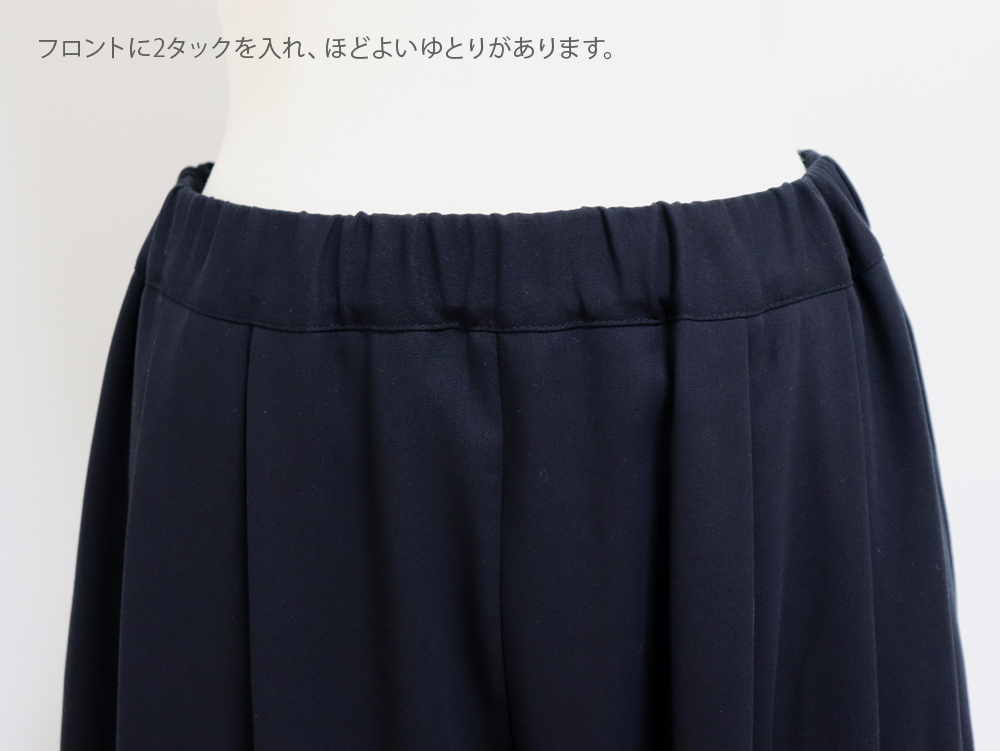 股上が深めで、ウエスト両サイドに2本ずつタックを入れることで、腰まわりにゆとりをもたせたリラックス感のあるはき心地。ヒップラインは自然な立体感がありながら、膝から裾に向かって細くなるテーパードシルエットが、すっきりとした印象に仕上げてくれます。