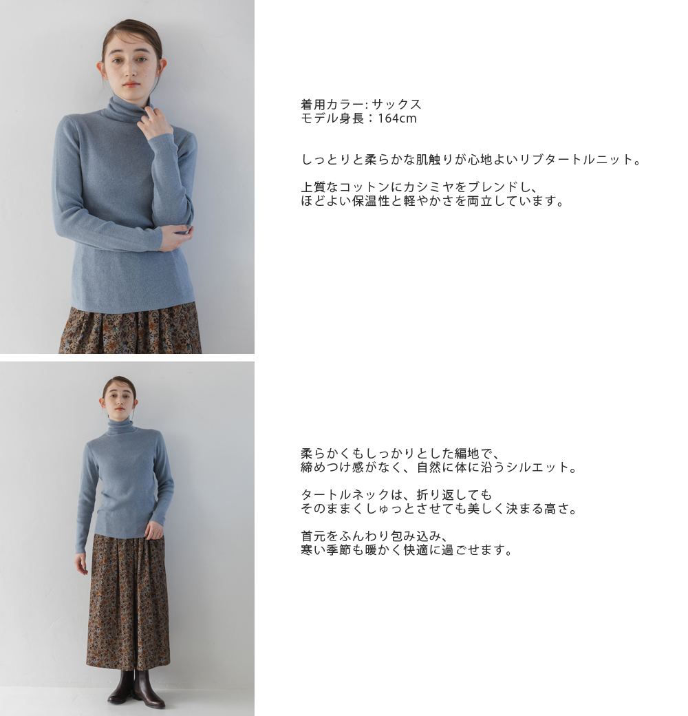 コットンにカシミヤをブレンドしたチクチク感が少ないリブタートルニット