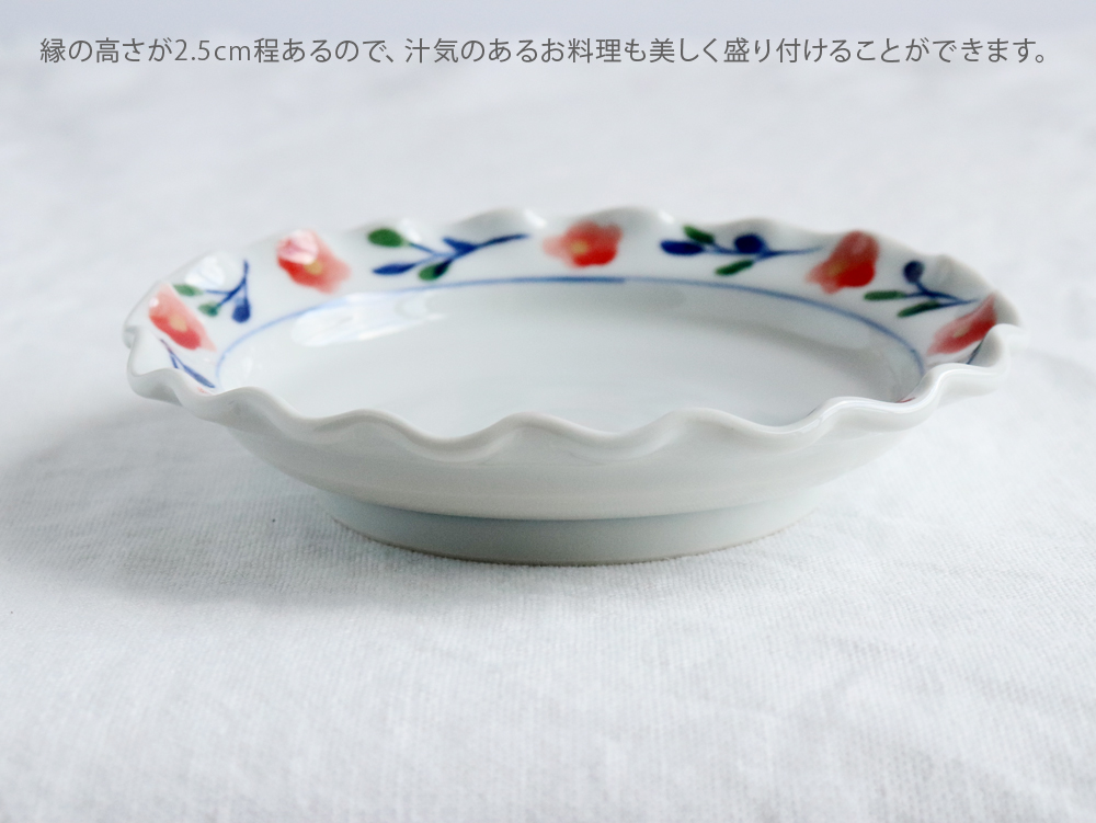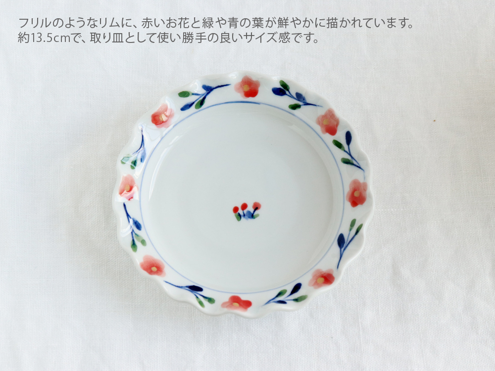 こちらは、赤いお花と緑や青の葉が優しく描かれた直径13.5cm(約4寸)のフリル皿。縁には約2.5cmの高さがあり、汁気のあるお料理もしっかりと受け止めて、美しく盛り付けることができます。取り皿にもぴったりな大きさで、副菜やおやつをのせて、食卓を彩ってくれる一皿です。