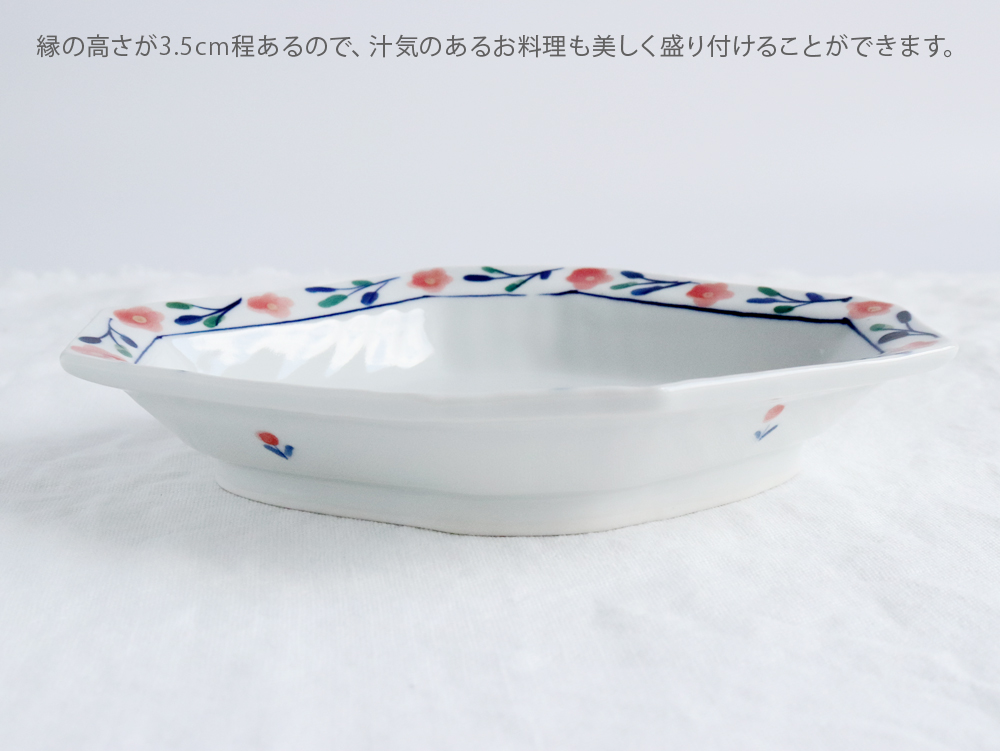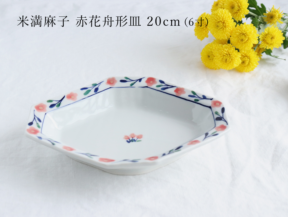 こちらは、赤いお花と緑や青の葉が優しく描かれた、幅20cm(約6寸)の舟形皿。縁には約3.5cmの高さがあり、汁気のあるお料理もしっかりと受け止め、美しく盛り付けることができます。少し大きめの取り皿としても便利で、副菜やおやつをのせて食卓を華やかに彩ってくれます。