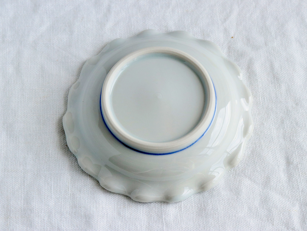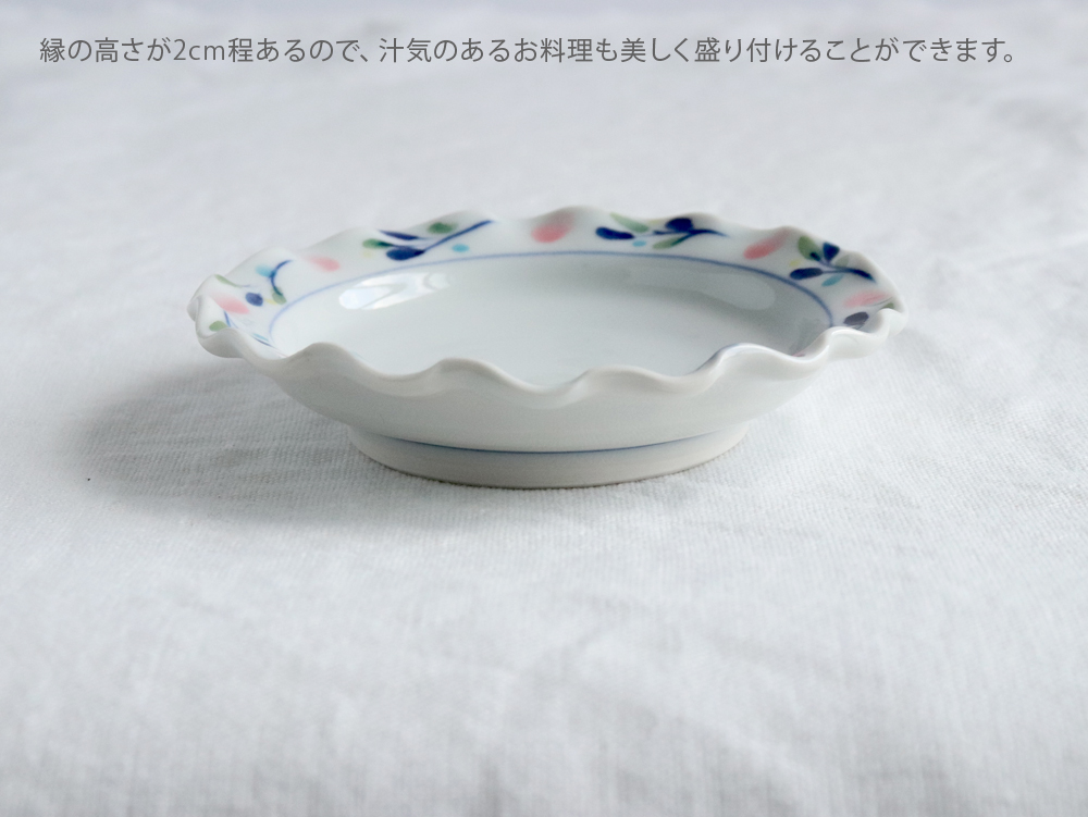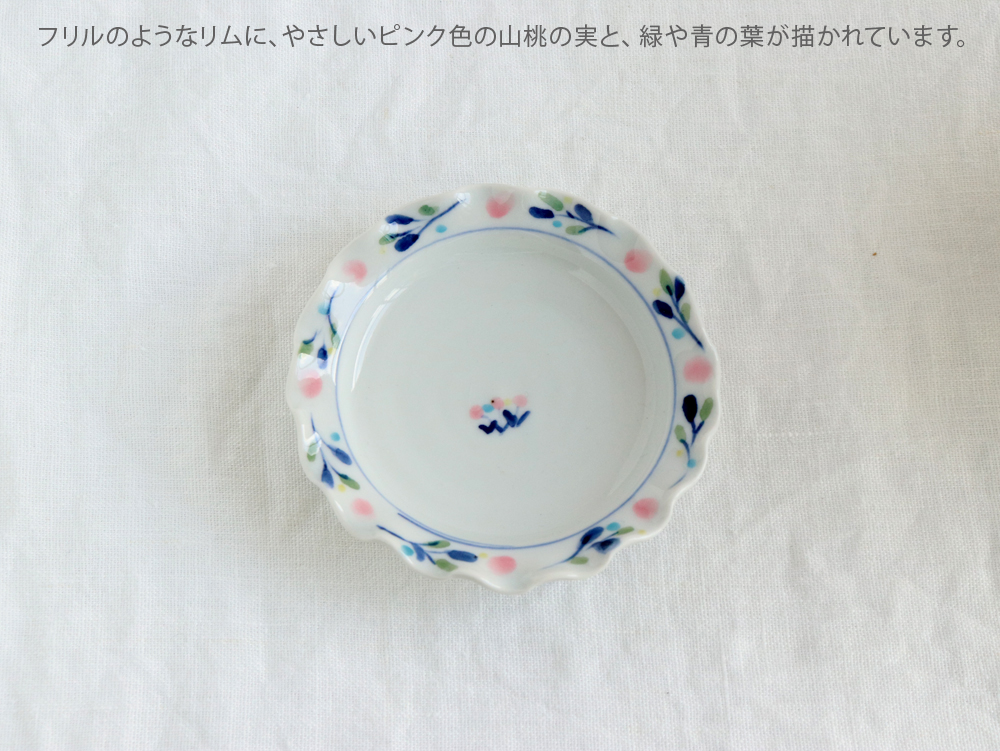 こちらは、やさしいピンク色の山桃の実と、緑や青の葉が描かれた、直径11cm(約3.6寸)のフリル皿。ひとり分の副菜や、お菓子などをちょっと盛るのにちょうどいいサイズ感。縁には約2cmの高さがあり、汁気のあるお料理もしっかりと受け止めて、美しく盛り付けることができます。