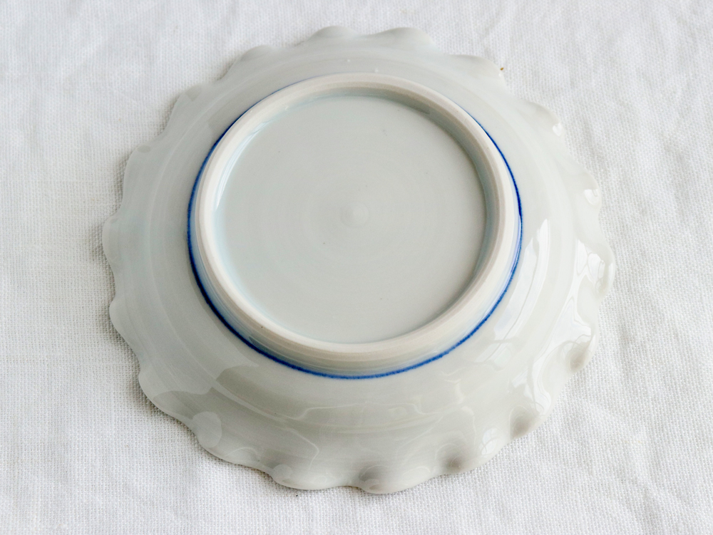 こちらは、やさしいピンク色の山桃の実と、緑や青の葉が描かれた、直径13.5cm(約4寸)のフリル皿。縁には約2.5cmの高さがあり、汁気のあるお料理もしっかりと受け止めて、美しく盛り付けることができます。取り皿にもぴったりな大きさで、副菜やおやつをのせて、食卓を彩ってくれる一皿です。