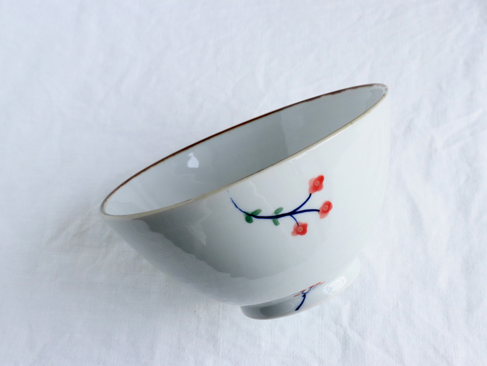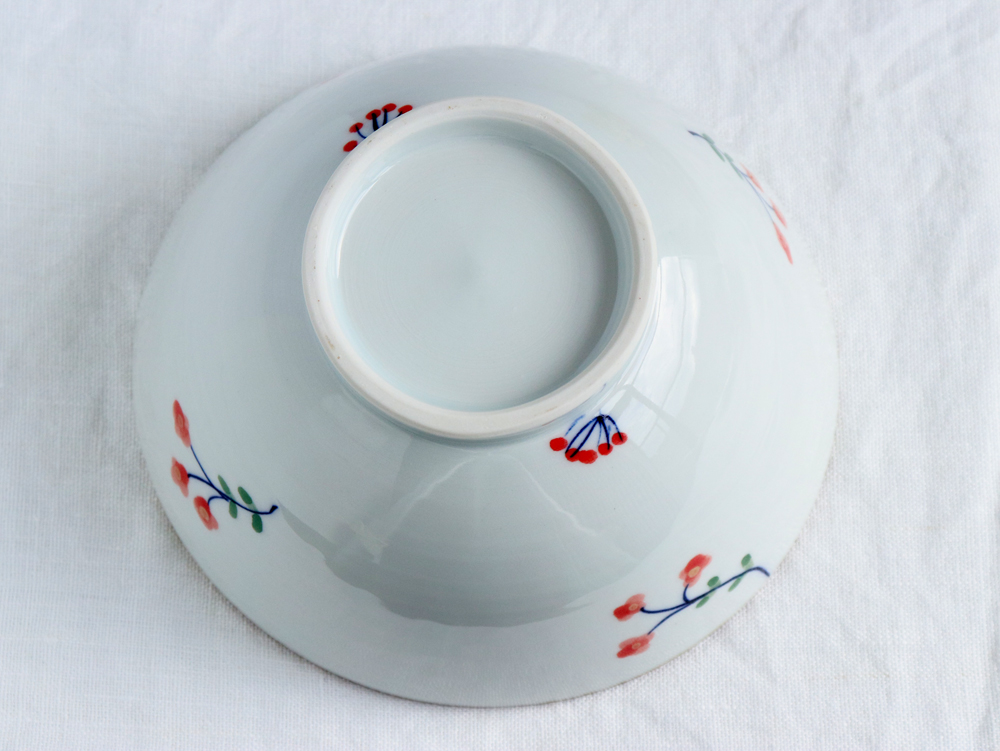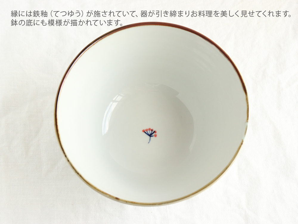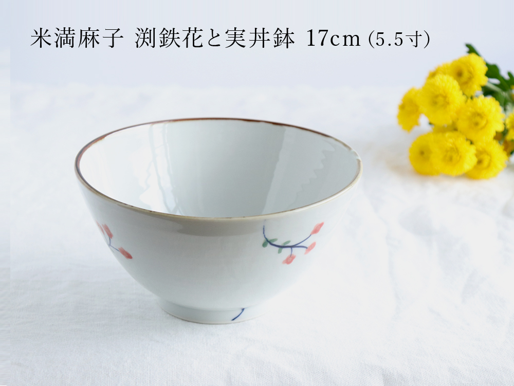 こちらは、お花と実が描かれた直径17cm(約5.5寸)の丼鉢。縁に施された鉄釉(てつゆう/焼成することで黒や焦げ茶色に発色させる技法)により全体が引き締まり、赤い花と実の鮮やかさを引き立ててくれます。深さは約8cmあり、どんぶりだけでなく麺や汁物にもぴったり。和洋中どんなお料理にも使える万能なうつわです。