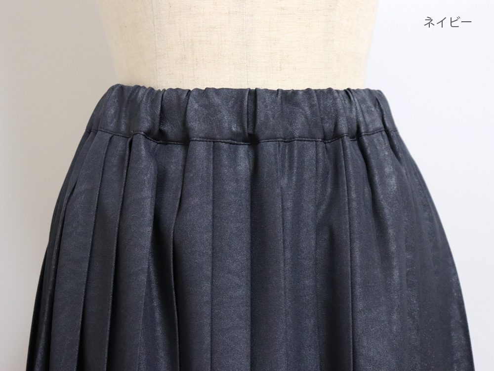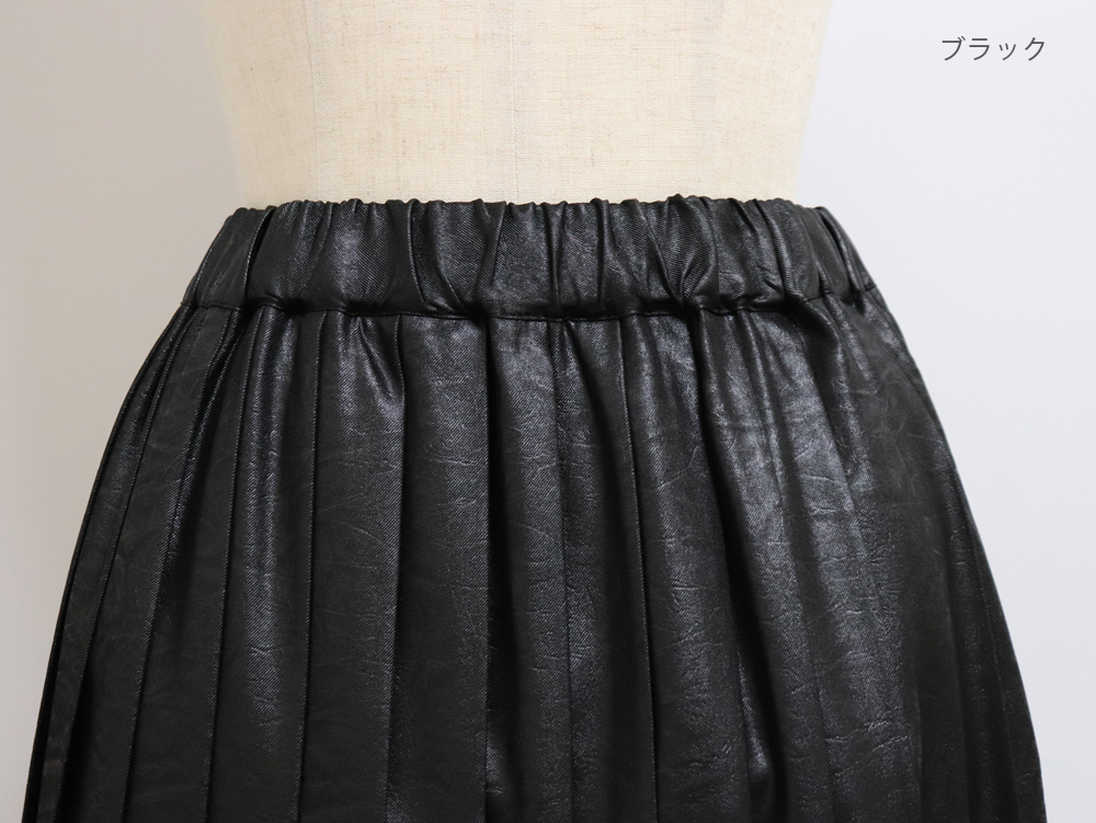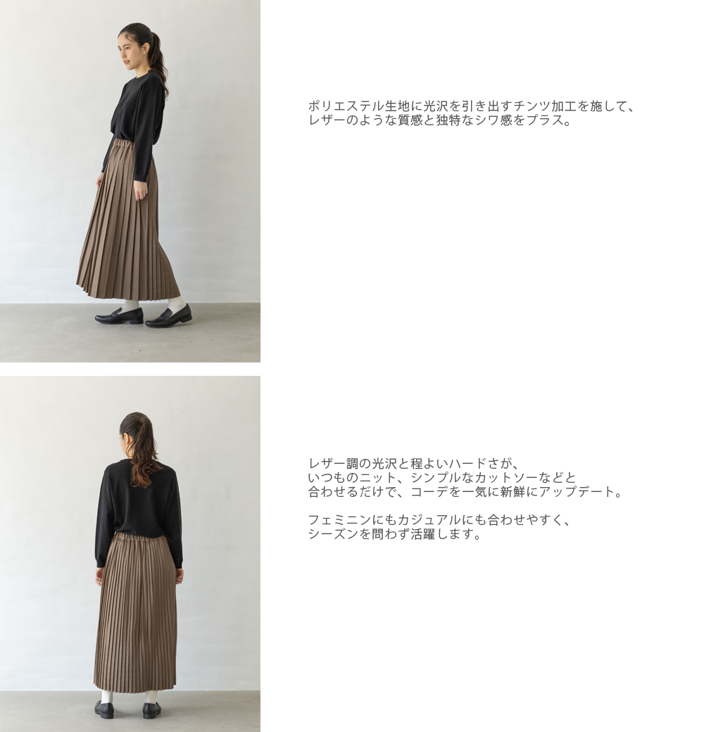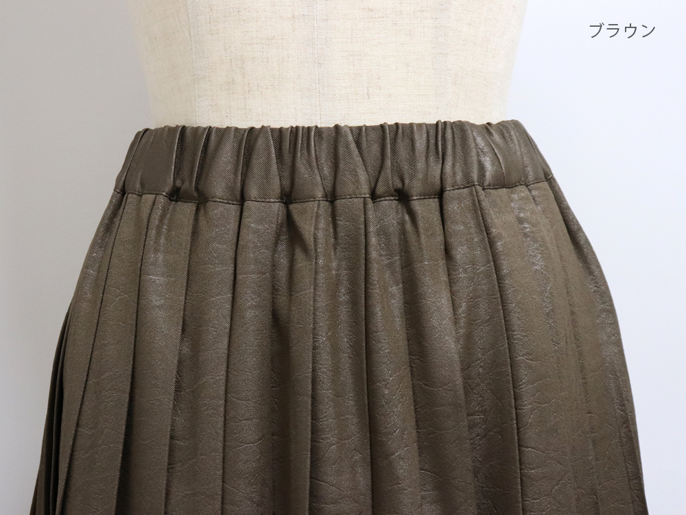 レザー調の光沢とほどよいシワ感がカッコいい!歩くたびに上品に揺れる大人の上質プリーツスカート