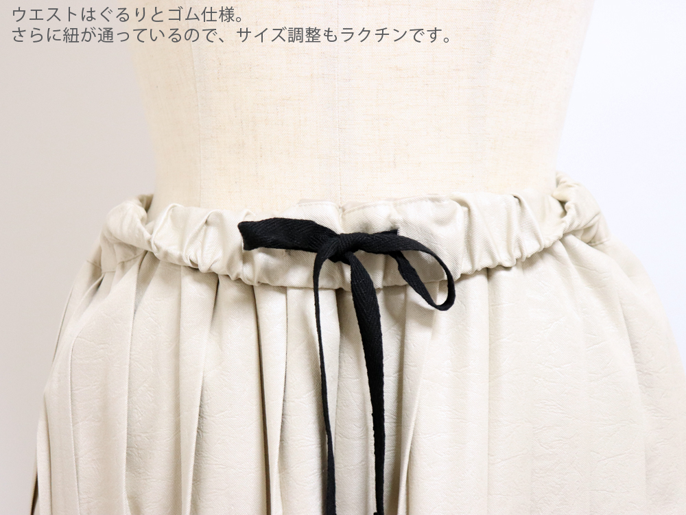 春、秋、冬とロングシーズン活躍する、レザー調のプリーツスカートです。