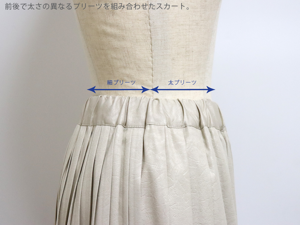 ストンと落ちるシルエットですっきり見せてくれる効果の高いデザインは、前後で太いプリーツと細いプリーツ、2種類のプリーツが楽しめます!