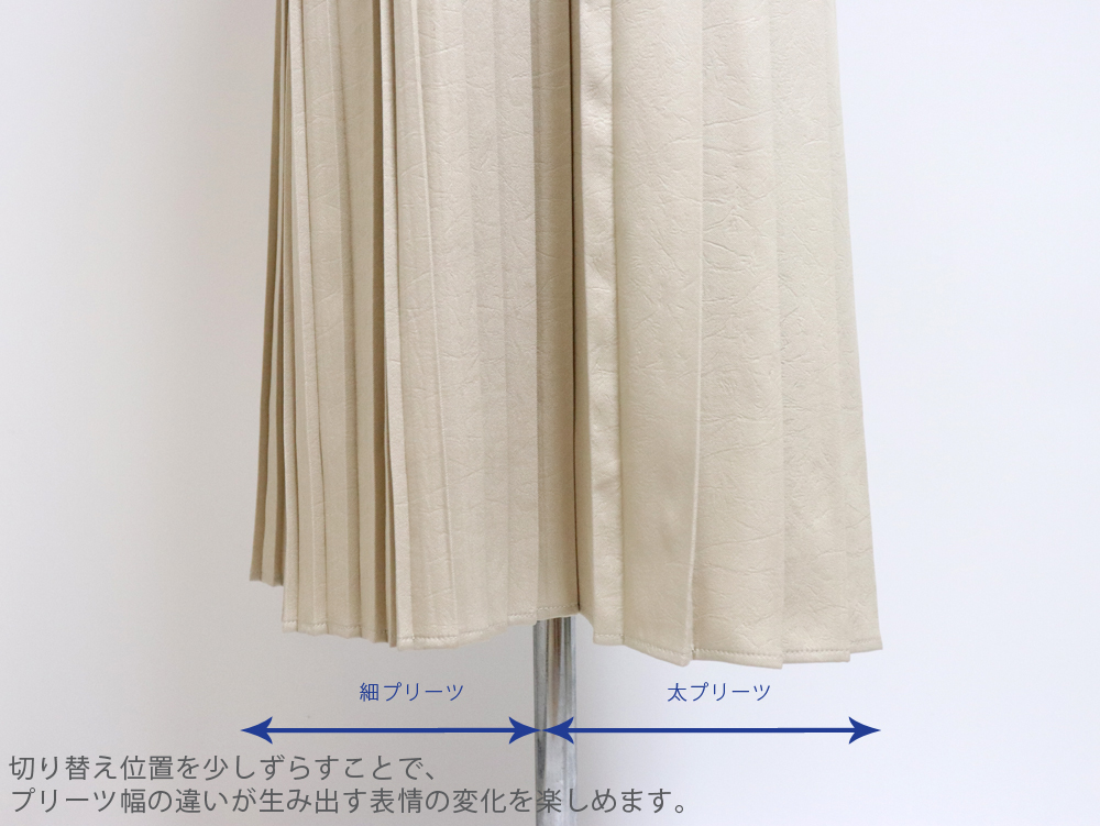 太いプリーツは幅4センチ、はっきりとしたシャープな印象、細いプリーツは幅2センチで、繊細でフェミニンな印象に!