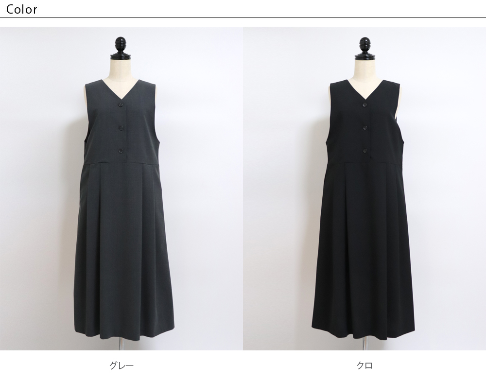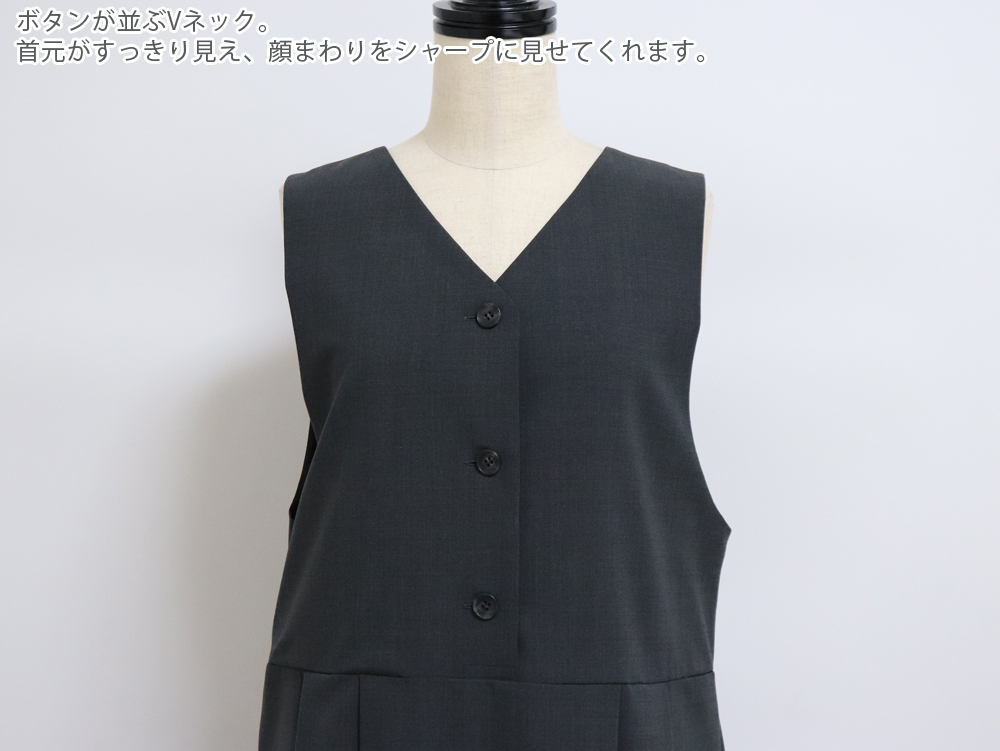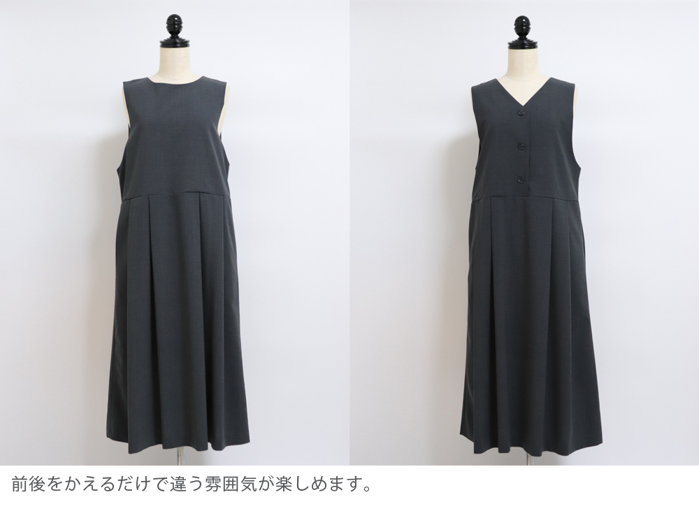 クルーネックのデザインはフォーマルに、Vネック+ボタンのデザインは少しカジュアルに、とどちらを前にするかで印象が変えられますので、1着で2着分楽しめますよ。