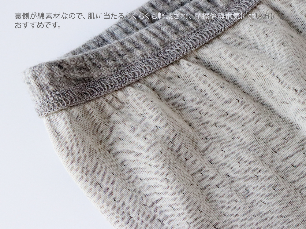 ダブルガーゼならではのふわふわとした柔らかさが、肌に吸いつくように馴染み、まるで履いていることを忘れてしまうほどの軽やかさ。適度なフィット感がありながらも、締めつけ感がなく快適に着用できます。